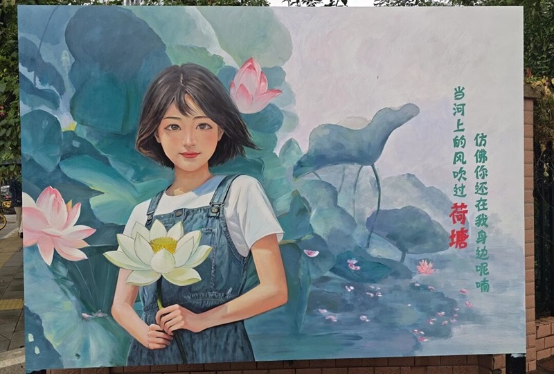 在荷塘路口,台融君看到荷塘旅居酒店门口的地面上,绘制了以荷塘为主题的彩绘,朵朵盛放的荷花,鲤鱼在碧绿的荷叶间嬉戏,显得栩栩如生。不远处立着一个亮黄色的休闲长椅,椅背由荷塘的拼音组成。路口墙面上的彩绘同样夺人眼球。一位少女手持一朵绽放的荷花在荷塘间亭亭玉立,并配上“当河上的风吹过荷塘,仿佛你还在我身边呢喃”的文字,把社区名字和路名巧妙地镶嵌其中。