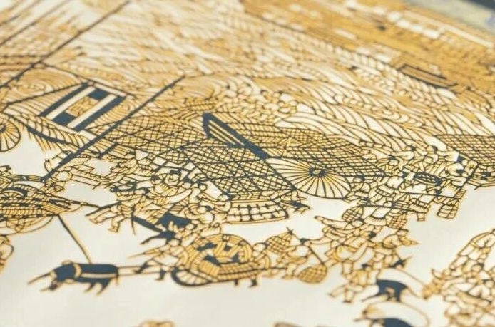 创作中,刘美寿将多年深耕的书法功底与剪纸技艺无缝融合。“最难的是人物神态拿捏和书法字迹的剪纸呈现,每一刀都要稳,每一剪都要准。”他介绍,“我每天反复揣摩原作的笔墨意境与市井气息,力求每个细节都生动传神。”半年来,他每天创作超8小时,用掉三、四块蜡板,手指常被刻刀磨出水泡。这种近乎苦修的坚持,正是非遗传承人匠心精神的真实写照。
