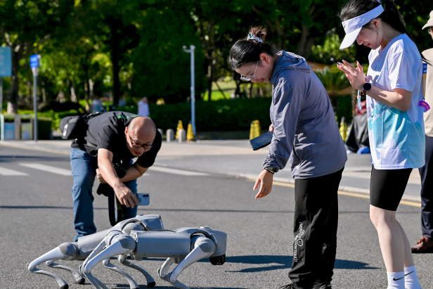 本次赛事以“智竞未来”为主题,首次引入“具身智能”机器人作为陪跑员,上演了一场“人机共跑”的科技实验,为传统的体育竞技注入了全新的未来感。比赛过程中,搭载了实时运动控制算法和路径预测系统的机器人,以稳定的节奏与参赛者并肩奔跑在园区赛道上,银白色的身影在阳光下格外醒目。这不仅是前沿科技的集中展示,也成为“科技融入生活”的一场生动实践。