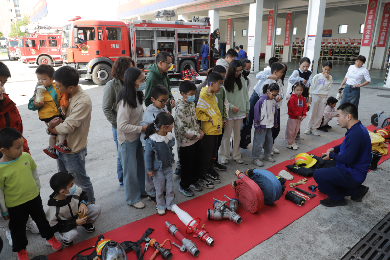 当天,在消防讲解员郑志强的热情讲解下,员工与孩子一同参观了消防救援装备器材。面对琳琅满目、功能各异的消防救援工具,大家充满好奇。讲解员细致讲解每件装备的用途与原理,并邀请孩子们亲手触摸、体验部分工具,在互动问答中将专业知识转化为生动有趣的安全课堂。