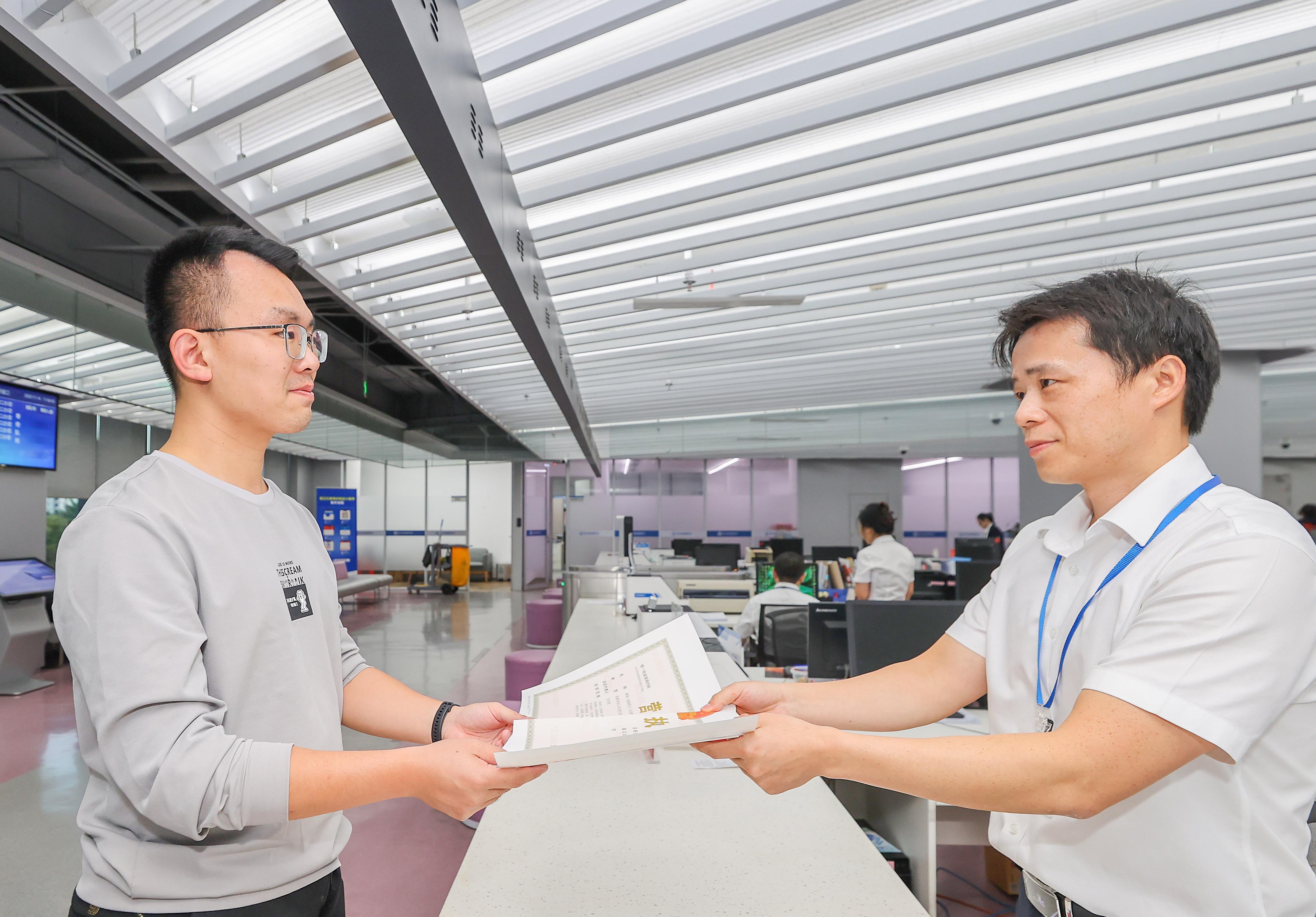 在晋江市行政服务中心市场监管窗口,李泽铭(左)接过崭新的营业执照。