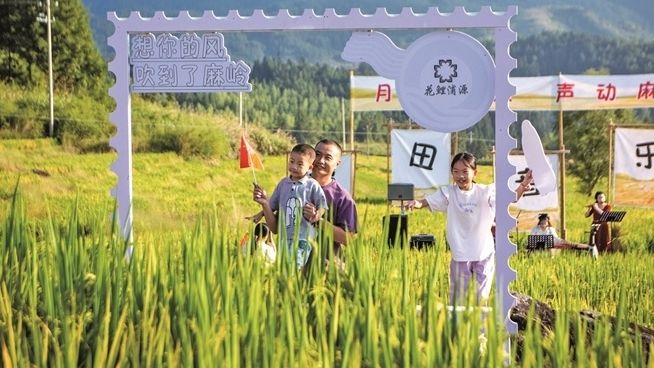 国庆假期,周宁县在麻岭梯田上搭建舞台,举办了“月满稻浪·声动麻岭——稻田音乐会”,乐声环绕稻秆,音符与稻穗共舞,自然与艺术相遇,吸引不少游客在此赏秋景、品秋韵,穿梭稻田合影留念。“与朋友一起,到金色稻田里欣赏秋日美景,这是一个不错的体验。”游客陈先生举起手中相机定格下一个个美好瞬间。