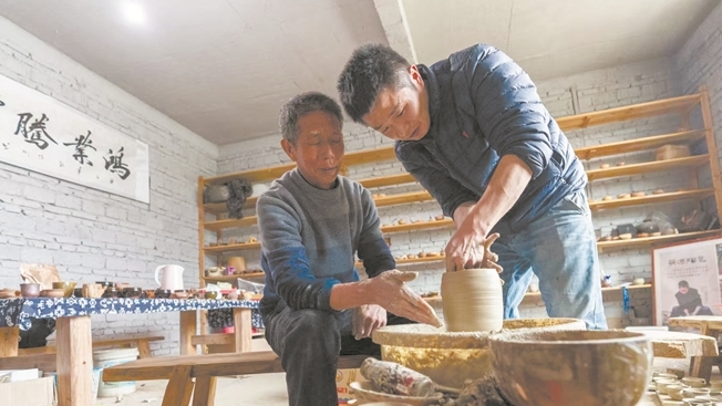 肖永灿和父亲一同研究创作新的硋器作品 刘志玮 摄