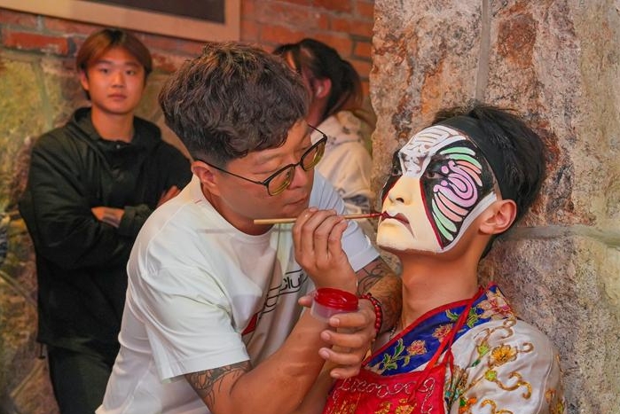 大赛现场,选手们抽签定角,手执彩墨,在演员脸庞上精准勾勒。来自台湾的庄俊益此次抽中“春大神”。他提笔蘸墨,在演员眼眶周围浓重点染,斜飞的墨团透出一股凌厉气势。