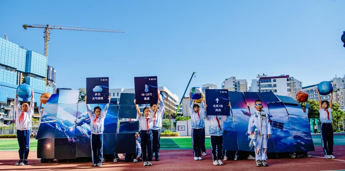 11 月 14 日上午,厦门市深田小学第五届校园体育节暨第三届田径运动会开幕式在操场举行。活动以 “童心筑梦・接力航天・强国有我” 为主题,将项目式学习成果融入运动场景,全校师生用跨学科创意表演串联航天征程,展现近邻共育的校园文化与学生逐梦力量。