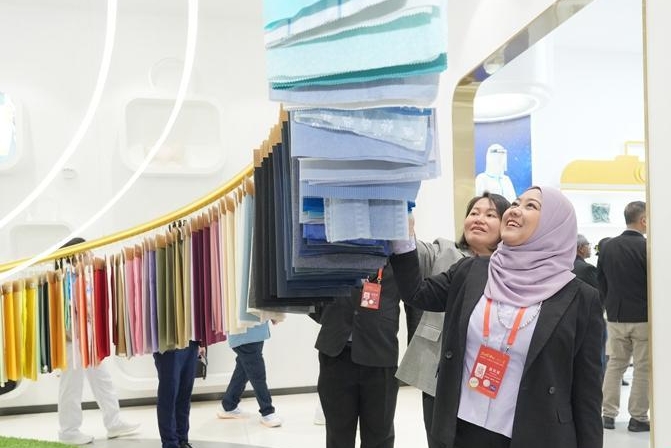 在永荣锦江展厅,东盟嘉宾零距离感受最新的纺织面料。