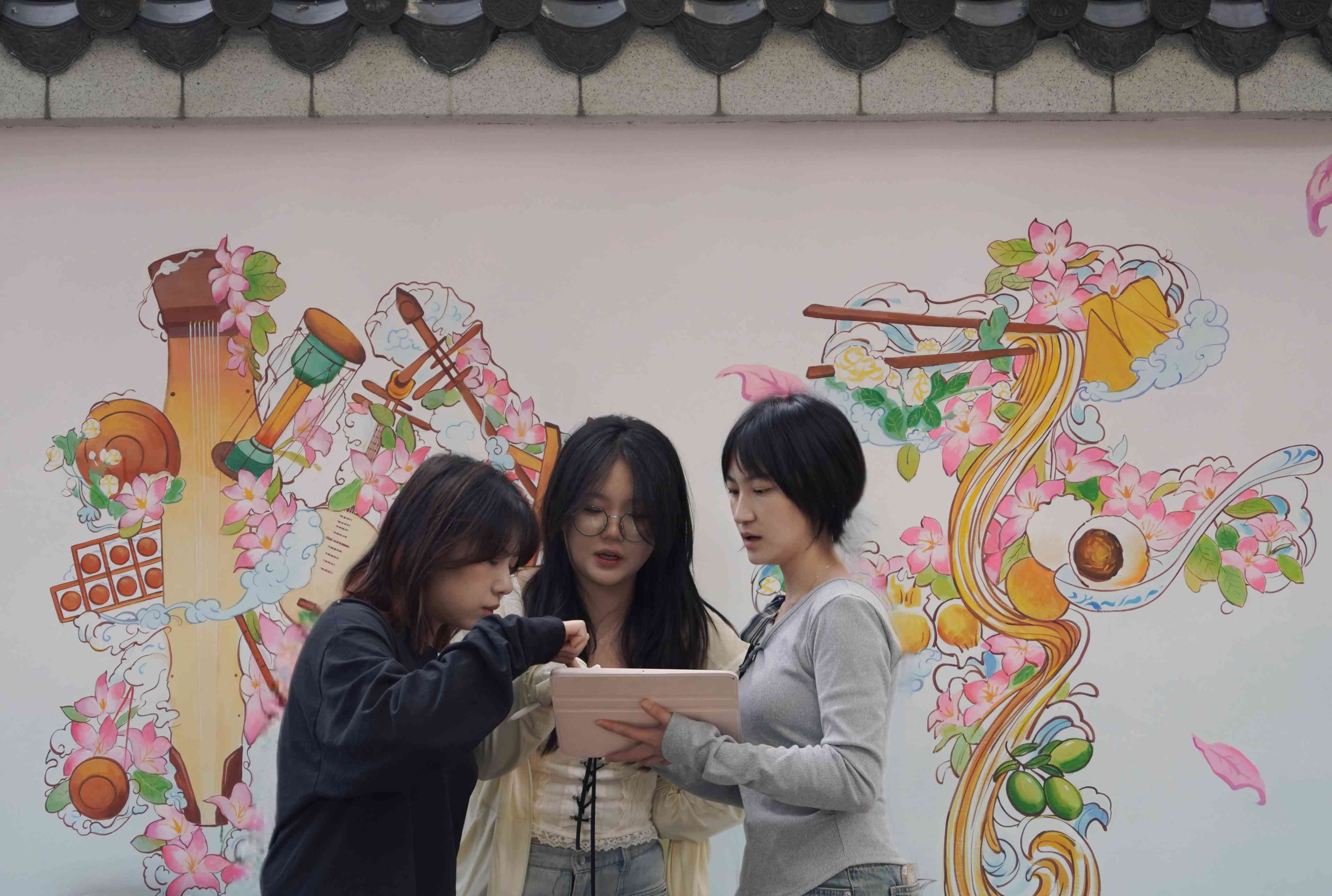 林小燕(右一)和大学生团队一起探讨壁画设计方案