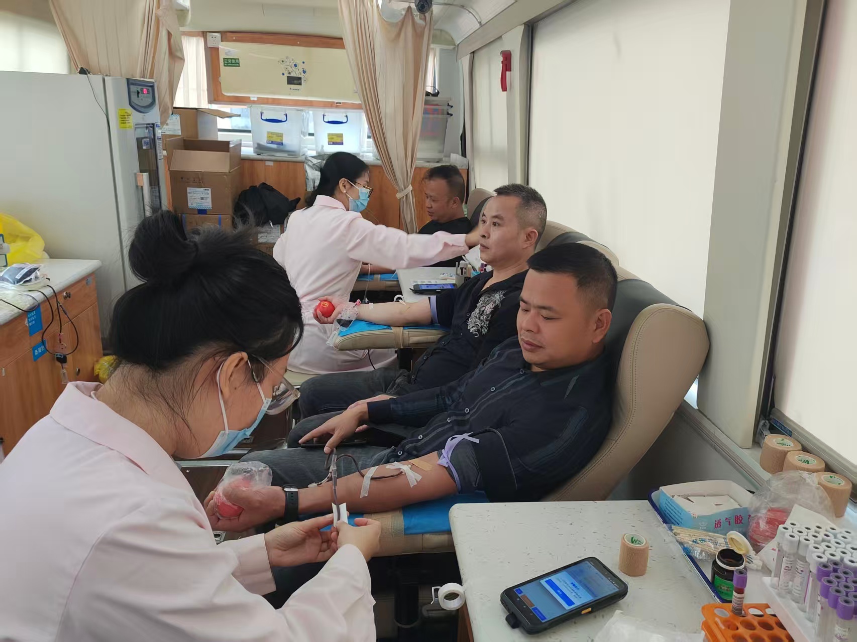 镇村干部早早来到现场,有序排队等候市中心血站献血车的到来。活动开始后,工作人员细致讲解献血注意事项,并指导大家进行线上预约登记,确保流程顺畅高效。随着献血车出现,现场气氛热烈,参与人员在引导下依次完成信息登记、血压测量和血液初筛等环节。工作人员贴心询问每位献血者是否用过早餐,并为通过初筛的人员准备了葡萄糖水和小面包,帮助补充能量、缓解紧张情绪。