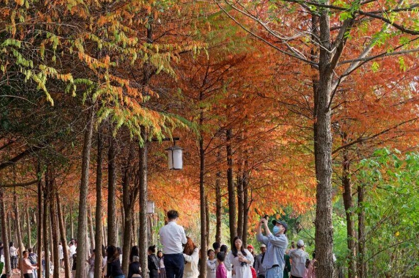 乌龙江公园湿地园区的杉树林,叶色由翠绿转为橘红,宛若一幅油画,吸引了不少市民来此打卡。(石磊磊/文)