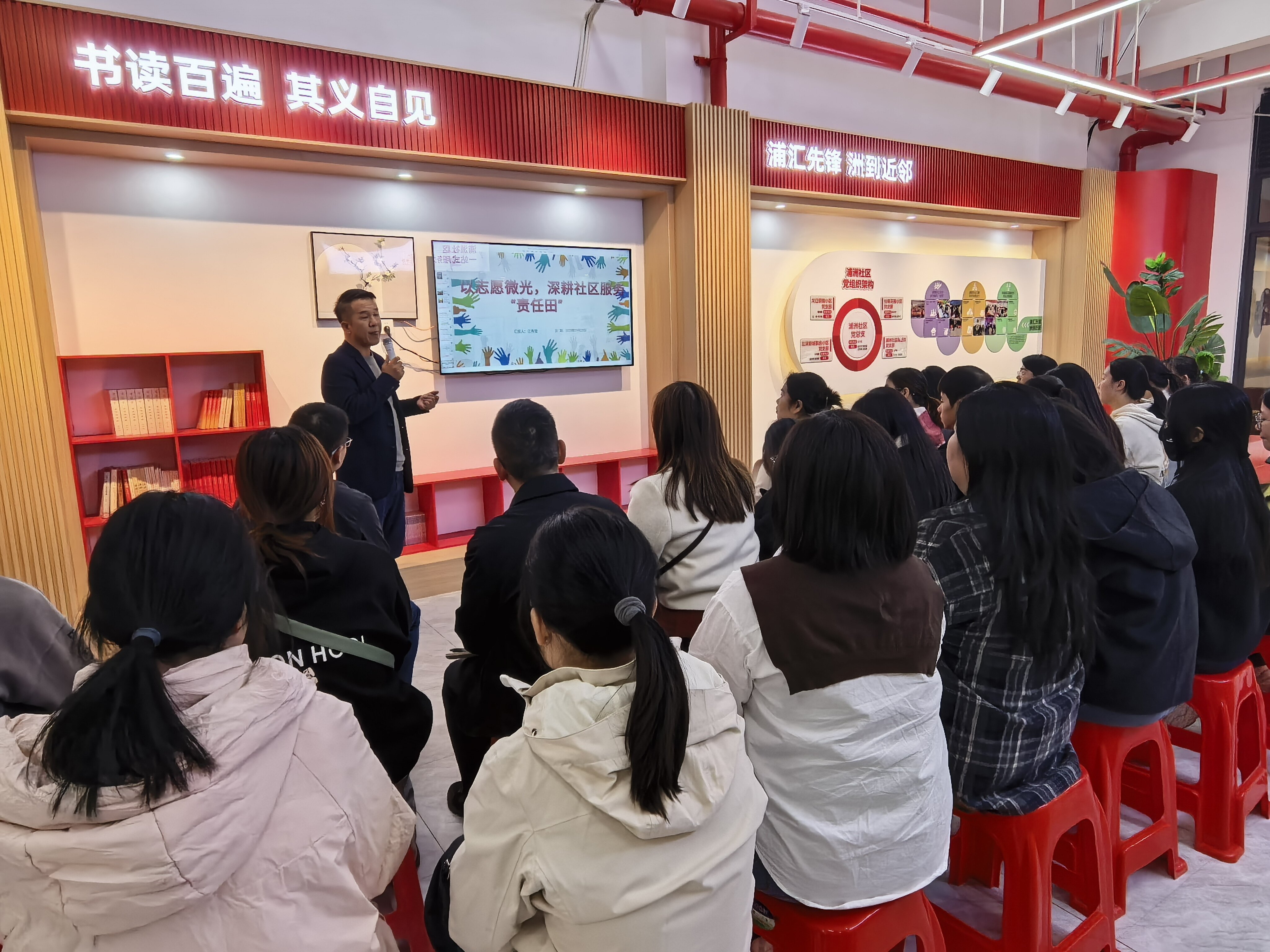 交流互动环节,参会的30名社工围绕“志愿服务资源整合”“专业学生社区实践路径”等关键问题展开热烈研讨。活动最后,全体人员实地观摩了浦洲社区志愿服务站点,详细了解站点的功能布局及项目运营等机制,将理论经验转化为直观认知,为后续工作开展奠定了坚实基础。