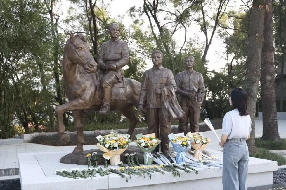 今年国庆前夕,《统一之愿》群像铜塑落成。这组以破晓时分台湾为背景的雕塑,刻画了三位英雄的形象——吴石将军策马前行,副官王正均紧随其后,聂曦手执望远镜,他们目光坚定地望向海峡这边的故土福州。雕塑前方,一束束鲜花静静绽放,诉说着后人无尽的敬意。