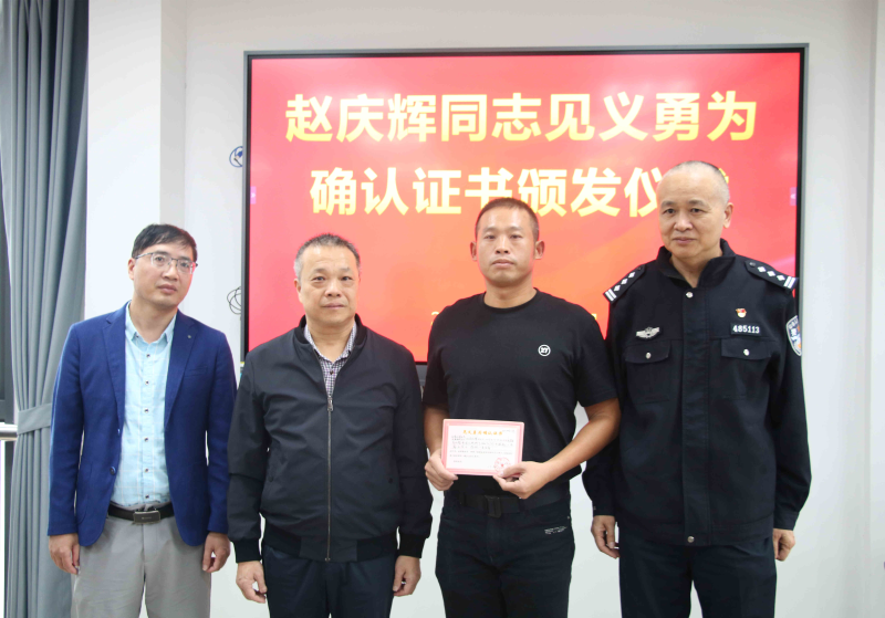11月19日,泉州市安溪县见义勇为工作协会联合参内派出所,专程前往县林业局,为勇救落水者的赵庆辉颁发见义勇为确认证书。