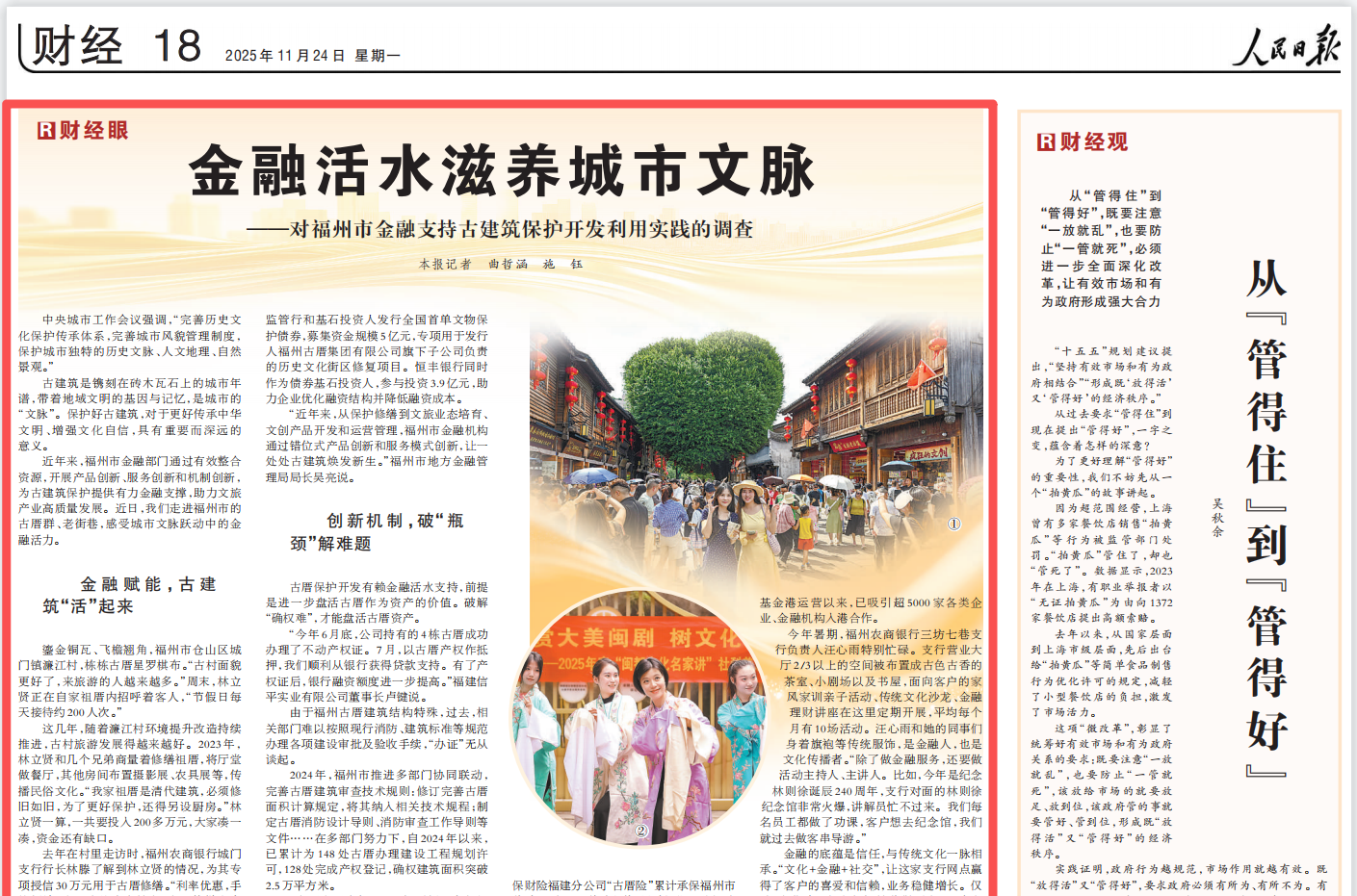 11月24日,人民日报财经版头条刊发报道《金融活水滋养城市文脉——对福州市金融支持古建筑保护开发利用实践的调查》。近年来,福州市金融部门通过有效整合资源,开展产品创新、服务创新和机制创新,为古建筑保护提供有力金融支撑,助力文旅产业高质量发展。