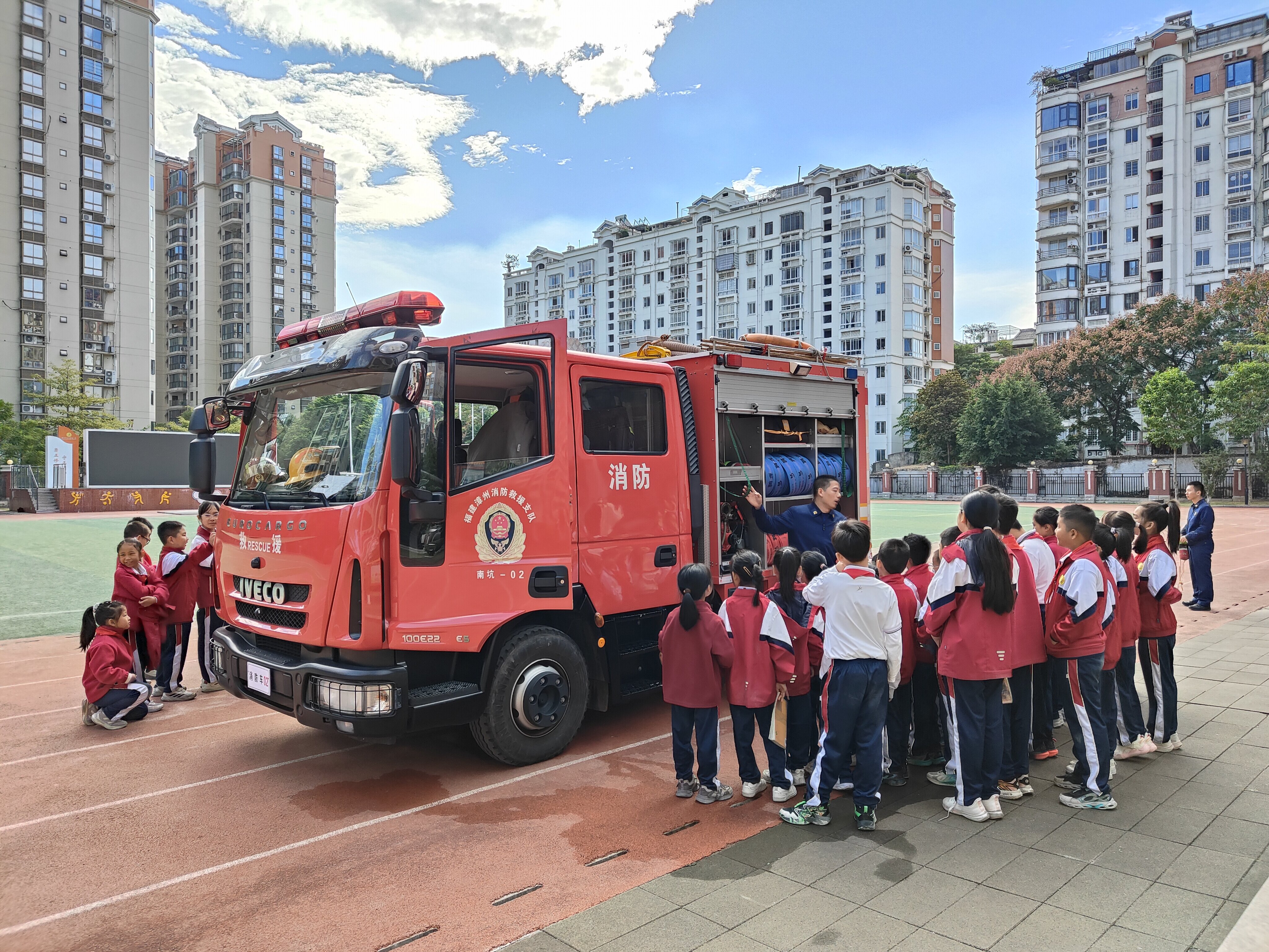 在操场的另一端,孩子们团团围住一辆车厢门敞开的消防车,津津有味地听着消防员讲解消防车的“百宝箱”,银亮的高压水带、能轻松剪断钢筋的液压钳、可耐千度高温的避火服等,每一样都让孩子们们发出惊叹。