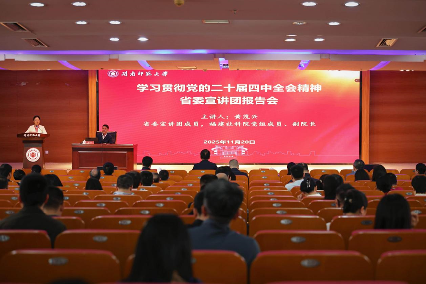 福建日报·新福建客户端 11月24日讯(通讯员 陈秋燕)11月20日,学习贯彻党的二十届四中全会精神省委宣讲团走进闽南师范大学开展专题宣讲。省委宣讲团成员,福建社会科学院党组成员、副院长黄茂兴教授作题为《科学谋划“十五五”发展蓝图是奋力开创中国式现代化新局面的历史主动》的专题辅导报告。闽南师大党委副书记廖志丹主持报告会。