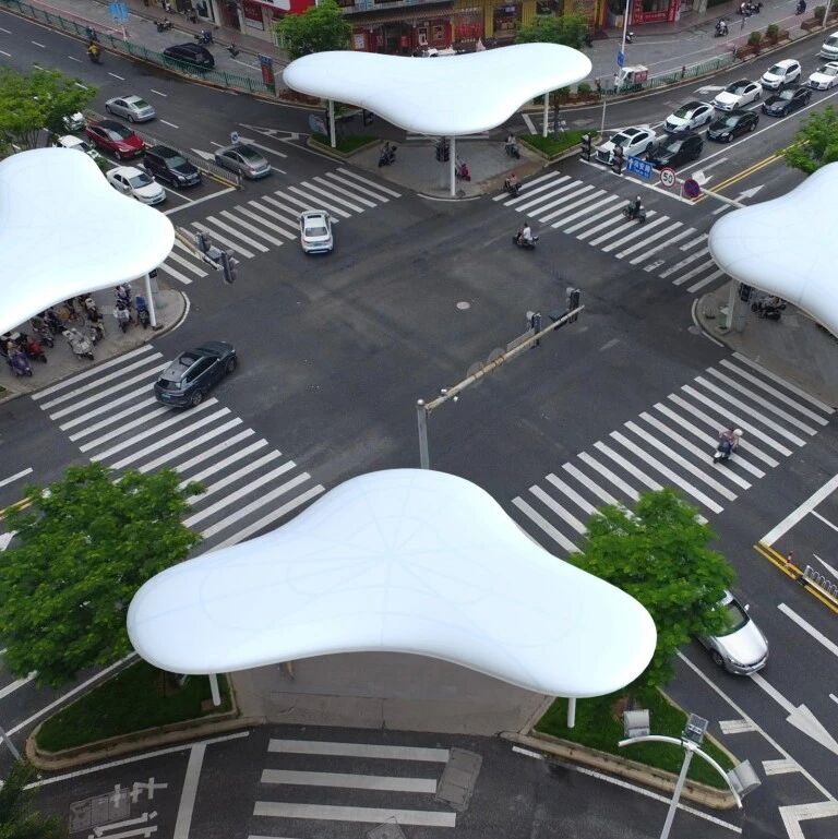采用流线型曲线造型的遮阳棚,白色张拉膜结构轻盈舒展,阻挡紫外线的同时保持视觉通透性,实现功能性与景观性双重效果,塑造兼具功能性与地域标识性的城市景观构筑物。该样式用于刺桐路与湖心街、刺桐路与丰泽街、刺桐路与津淮街、刺桐路与泉秀街。