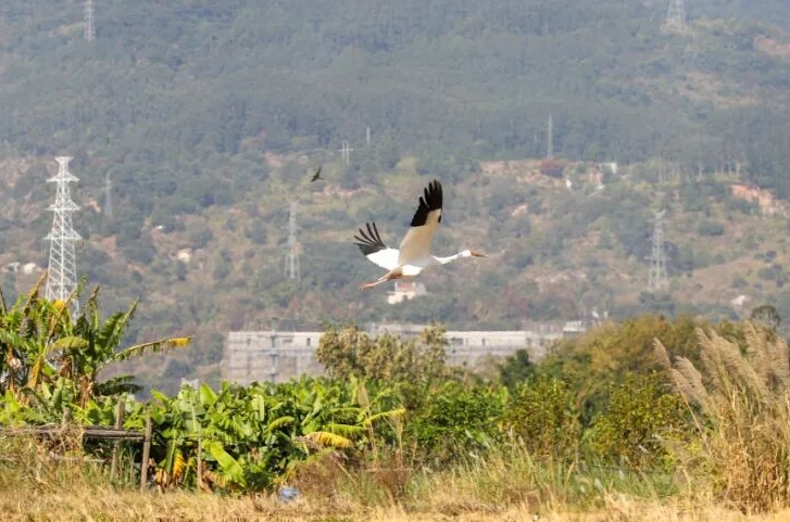 “我们了解到白鹤迁徙过程需要消耗大量能量,就购买了一些荸荠和稻米撒在田间,希望可以帮它补充体力完成迁徙。”东岱镇林业站工作人员与山堂村妇联主席陈春花正在白鹤活动区域附近撒食物。