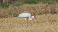 白鹤是国家一级重点保护野生动物、世界极危物种,素有“鸟类活化石”之称。站立时通体白色,胸和前额呈鲜红色,嘴和脚呈暗红色,飞翔时翅尖为黑色。