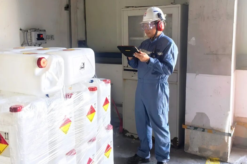 现在所有危废必须在中转区‘报到贴标’。”陈相依介绍,通过智能地磅称重、监管平台录入信息,系统自动生成标准化标签,实现“称重贴标一步到位”。他还同步建立危废数据库及电子台账,让每一笔危废的来源、去向清晰可溯,织密了一张覆盖全流程的“安全网”。