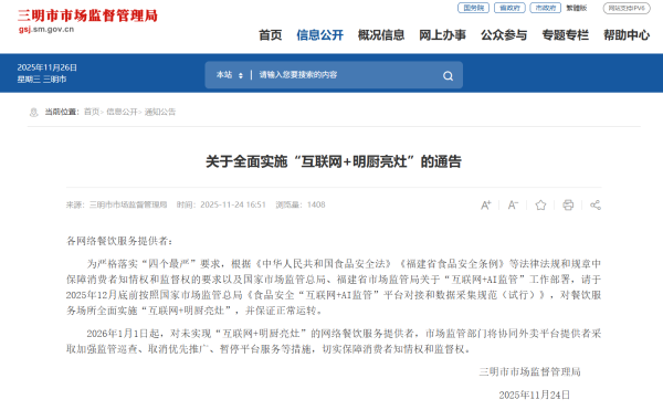 东南网11月26日讯 近日,三明市市场监督管理局发布通告,要求网络餐饮服务提供者于2025年12月底前按照国家市场监管总局《食品安全“互联网+AI监管”平台对接和数据采集规范(试行)》,对餐饮服务场所全面实施“互联网+明厨亮灶”,并保证正常运转。
