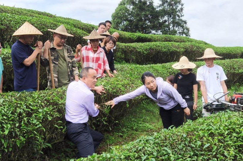 廖红教授(前排左二)在一处武夷山生态茶园指导茶农种植。(资料图)
