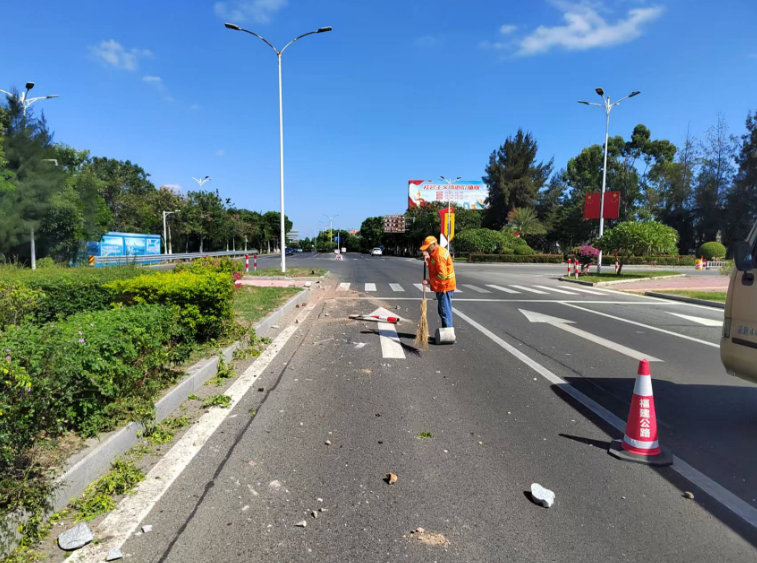 安全保畅“冲锋在前”。如往常一样,东山公路分中心党员沈添福带领白埕班站养护人员上路巡逻,巡至G357线k8+970陈城镇山只村路段时,发现右侧花台疑似遭撞击出现破损,人行道石柱及道口桩洒落一地,影响车辆通行。见此,沈添福站长发挥党员冲锋在前的精神,对事故现场开展安全布控,同养护人员们一齐搬走石柱、清扫碎石,及时恢复道路畅通。