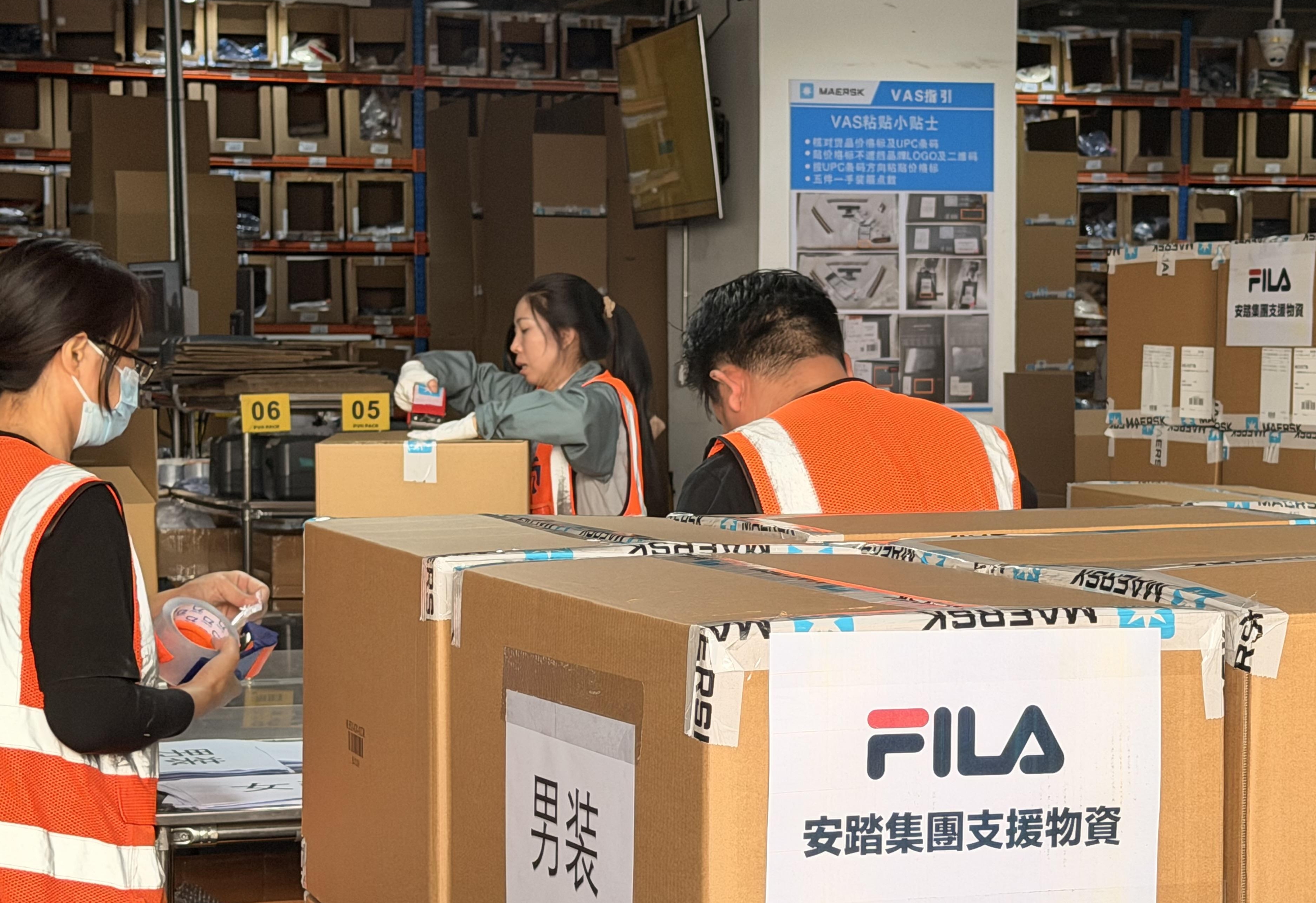 安踏集团首批物资整理打包完毕,将送往受灾地区。(安踏公司供图)