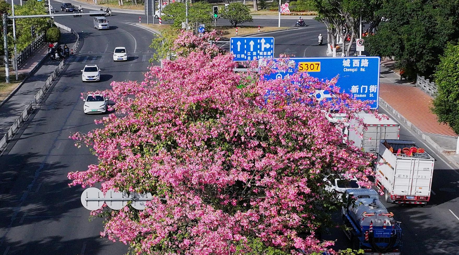 经过江滨北路往临漳门方向,一路上粉色绵延,成为一道亮丽的风景线。道路中间的绿化带上,高大的“美人树”树冠上缀满了粉红色的花朵,团团簇簇,如梦似幻。娇艳的花朵与沿途的城市建筑、过往车辆相映成趣,行人们不禁放缓脚步,或沿途欣赏,或举起手机记录下这限定版的冬日浪漫。