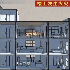 这种情况危险最小,火在上面,人在下面,火势和浓烟被楼板阻隔。只要从楼梯下楼即可,下楼时不要乘坐电梯。