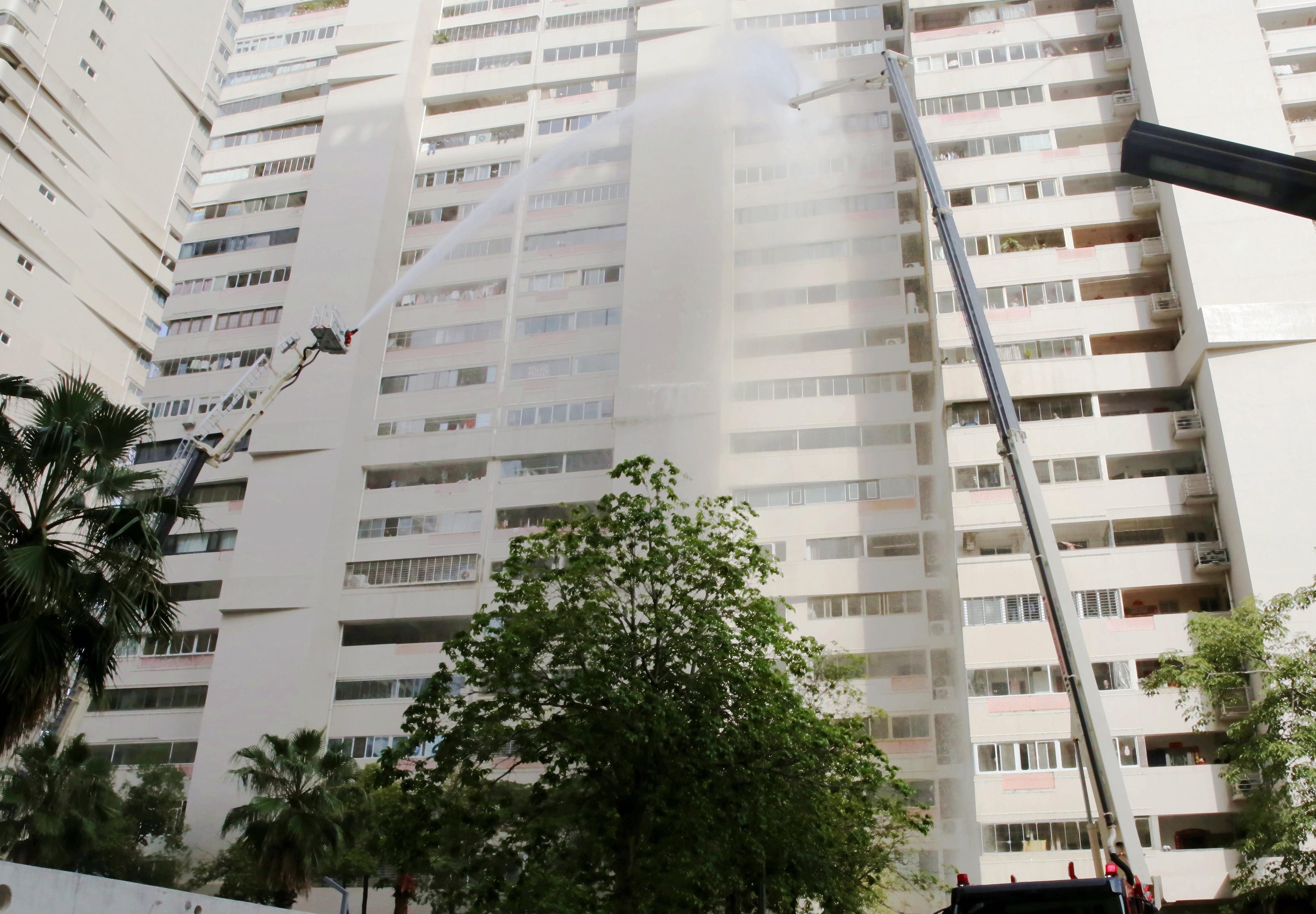 演练假设洛江区一小区25层的一套房发生火灾。小区立即启动建筑内部防排烟系统、固定消防设施,同时微型消防站人员组织人员疏散并出水灭火。当地消防部门接警后立即赶到现场展开救援。根据现场情况,消防救援人员在建筑东侧、北侧以及东南侧等多个方位的登高作业面,升起登高平台消防车和高喷消防车的作业臂,在外围对火势进行压制。