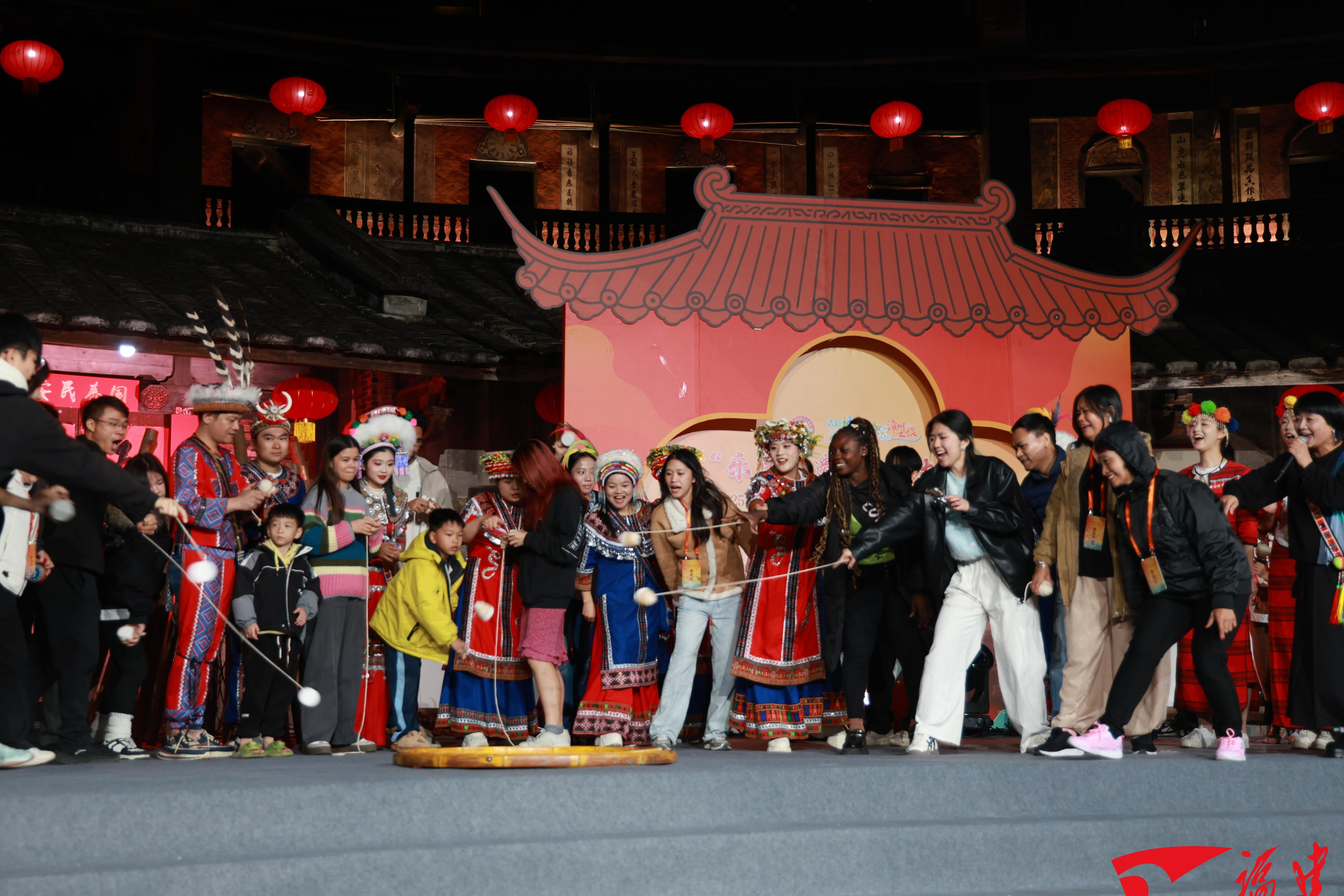 华安二宜楼里,高山族舞者与观众共跳竹竿舞,在清脆的竹竿敲击声中,体验着高山族传统节庆的欢快氛围。