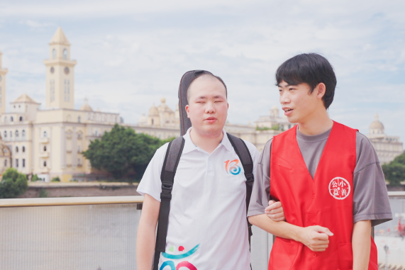志愿者带着郑达鸿(左)在闽江之心取景。(小善公益供图)