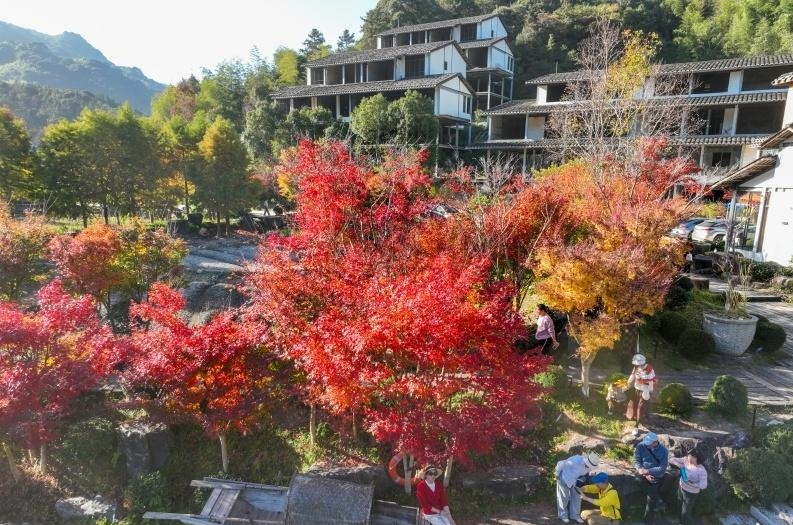 在双溪汇流的古桥边,岸边的枫叶红得愈发纯粹而热烈,高大的银杏则撑开了金黄色的巨伞。深浅不一、冷暖交织的丰富色彩,一同倒映在平静的溪面上,水波微漾,诗意盎然。(记者 朱榕)