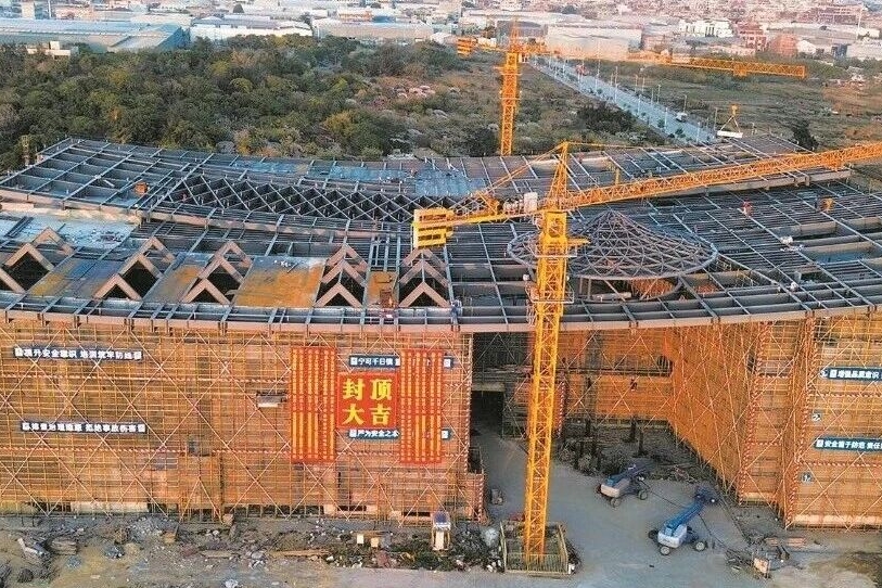 项目建设相关负责人介绍,主馆封顶后,项目将全面转入内部装修与展陈布置阶段。后续建设将秉承绿色三星标准,规划在一层打造智能旅游服务枢纽,二层构建沉浸式精神展示空间,三层建立活态非遗传承基地,致力打造一座“会呼吸、有灵魂”的文化场馆。