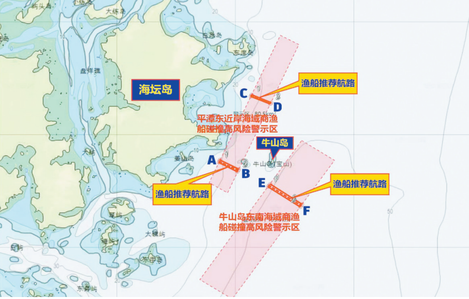 为防范商渔船碰撞事故发生,2022年福建海事局联合福建省海洋与渔业局划定公布平潭东近岸、牛山岛东南海域商渔船碰撞高风险警示区。此次则在前期公布的高风险警示区基础上,完成了渔船推荐航路划定。