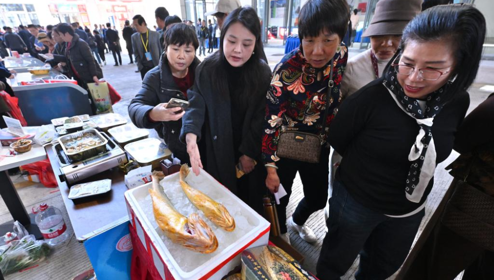 11月29日,嘉宾在第九届宁德(霞浦)大黄鱼产业创新发展大会线下展销促销活动上参观大黄鱼产品。新华社记者 姜克红 摄