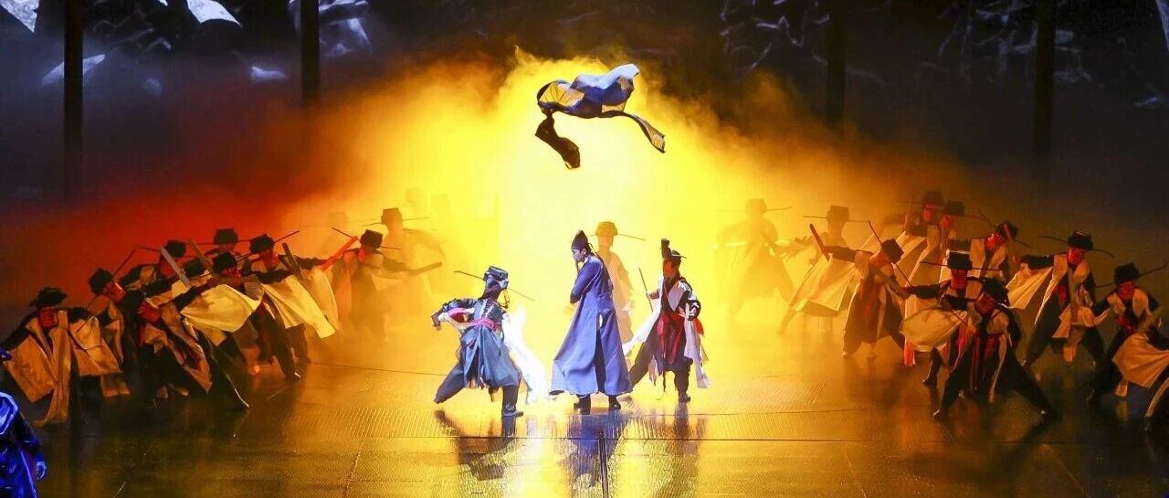 舞台变成巨大的“建本雕版”,缓缓抬升至60度倾斜。演员在斜台上起舞,回旋跳跃、腾挪跌宕,金色、红色、紫色光芒映照,建本上“大学之道,在明明德,在亲民,在止于至善”等字迹闪闪发亮。
