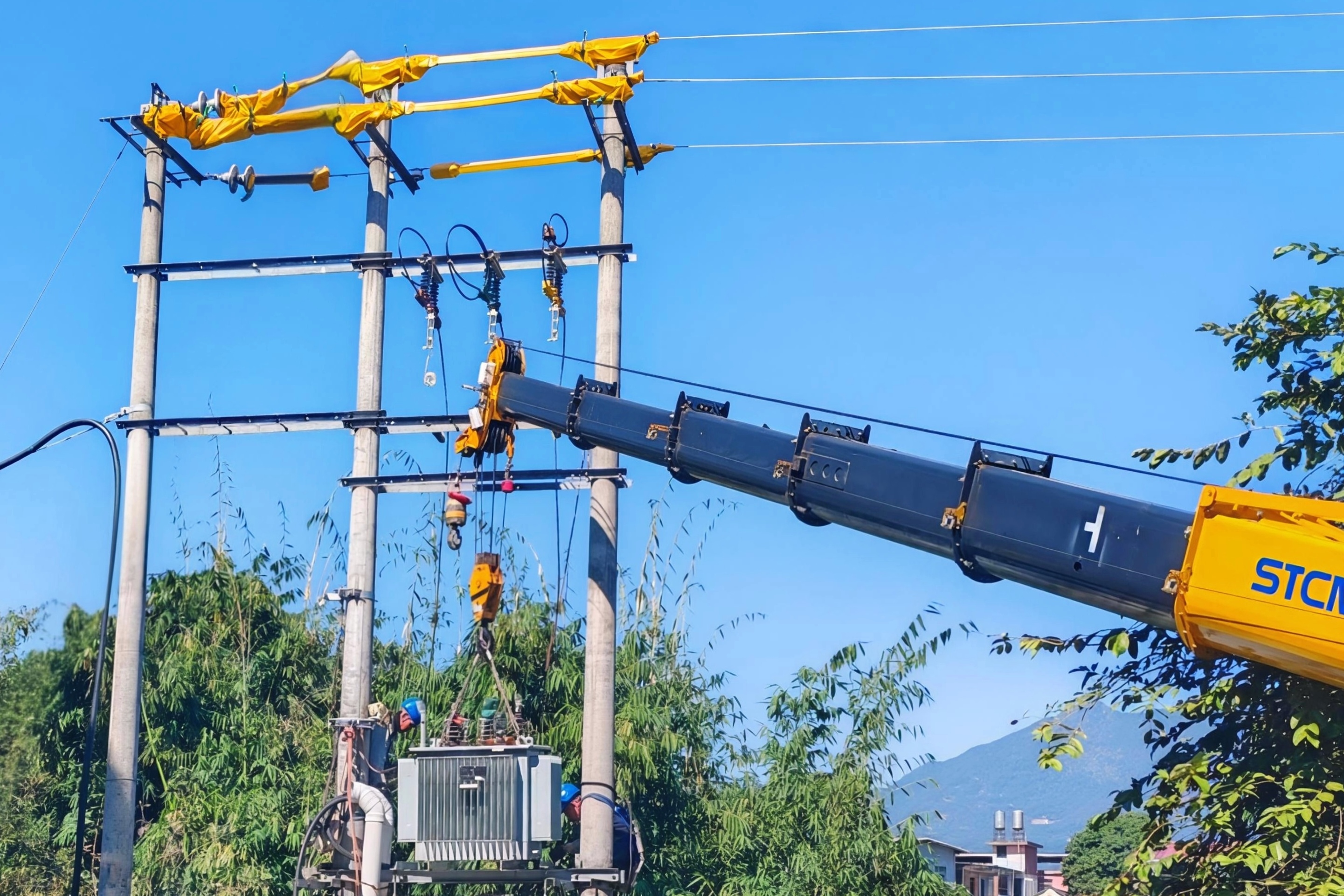 在改造现场,施工人员严格按照标准化作业流程,分工协作、有条不紊地开展工作。只见杆上杆下6名施工人员紧密配合,小心翼翼地将老旧变压器及配套的老化线路、表箱等设备拆除,随后低压电缆分支箱和一台崭新的400千伏安新型变压器相继进行吊装,绝缘导线架设、线路避雷器及接地装置安装等工作有序推进,每一道工序都规范到位。