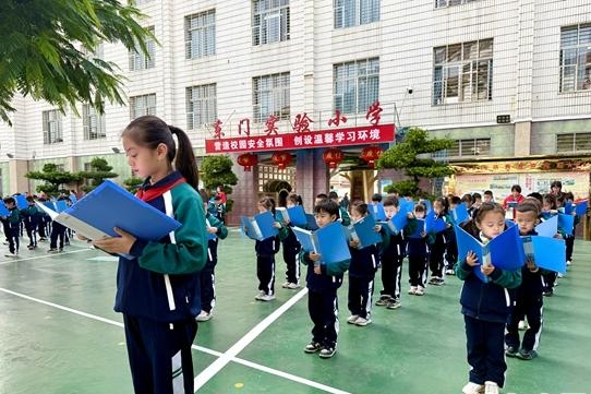 “凡读书,须整顿几案,令洁净端正。将书册整齐顿放,正身体对书册,详缓看字,仔细分明……”最近,每天上午大课间活动前,泉州市鲤城区东门实验小学一千多名学生拿着讲义夹走到操场,用五分钟时间齐声诵读《童蒙须知》。