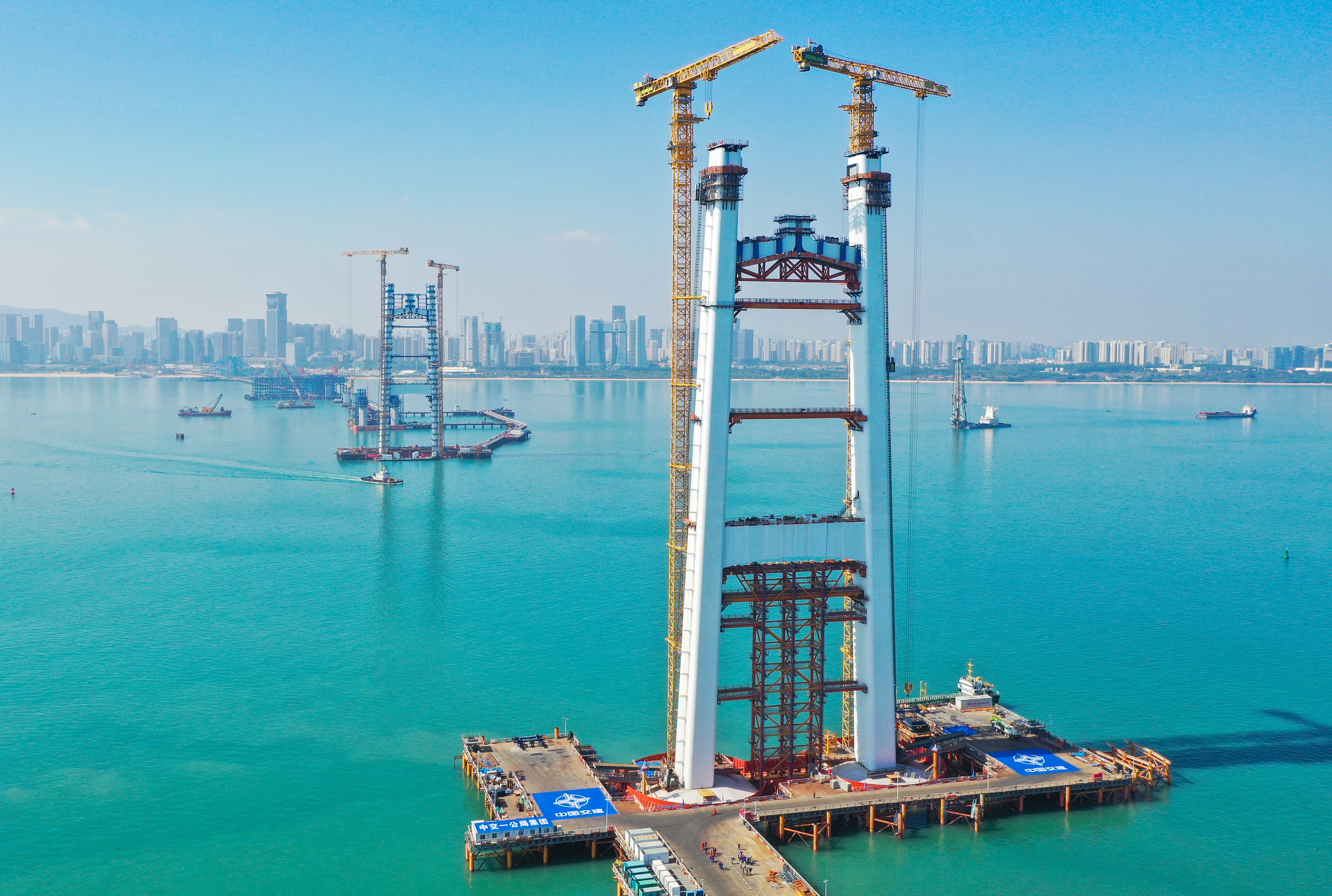 此次封顶的刘五店航道桥全长1948米,主跨928米,主塔高178.1米,是福建省最大跨径桥梁及首座全离岸式海中悬索桥,同时也是国内首座五跨连续三跨吊组合桥塔平面缆悬索桥。大桥单个主塔由60个钢壳节段和2道钢横梁构成,钢结构总重8798.2吨,单次吊装最大构件重量达750吨,施工面临全离岸海上超高结构作业、高精度拼装等多重技术挑战。