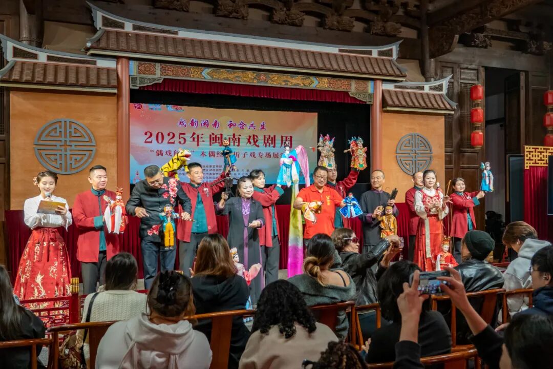 布袋木偶、提线木偶、铁枝木偶等表演者们登台与群众互动并合影纪念。漳州融媒记者 黄子君 摄