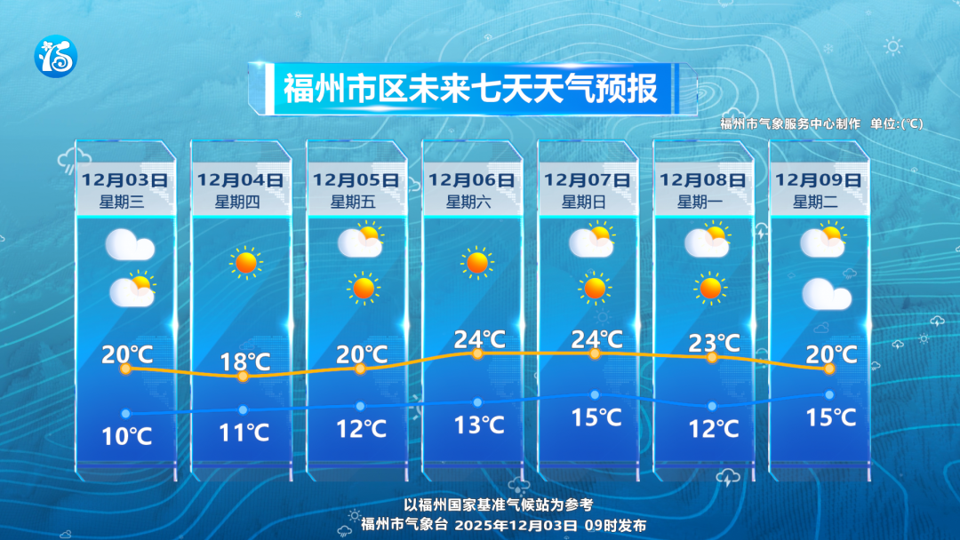 今起三天,福州市区最高气温维持在18~20℃之间,最低气温低至10℃出头。6日起气温有所回升,但8日又有冷空气影响,气温再次下滑,夜晨气温低,气温升降频繁,请根据气温的变化适当增减衣物。
