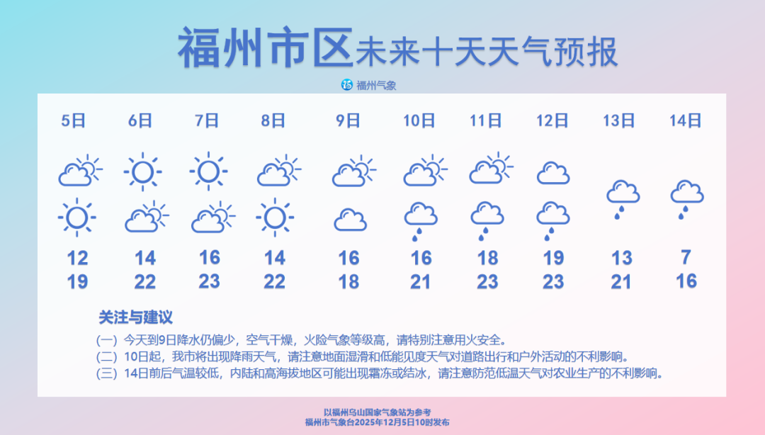 (二)10日起,福州将出现降雨天气,请注意地面湿滑和低能见度天气对道路出行和户外活动的不利影响。