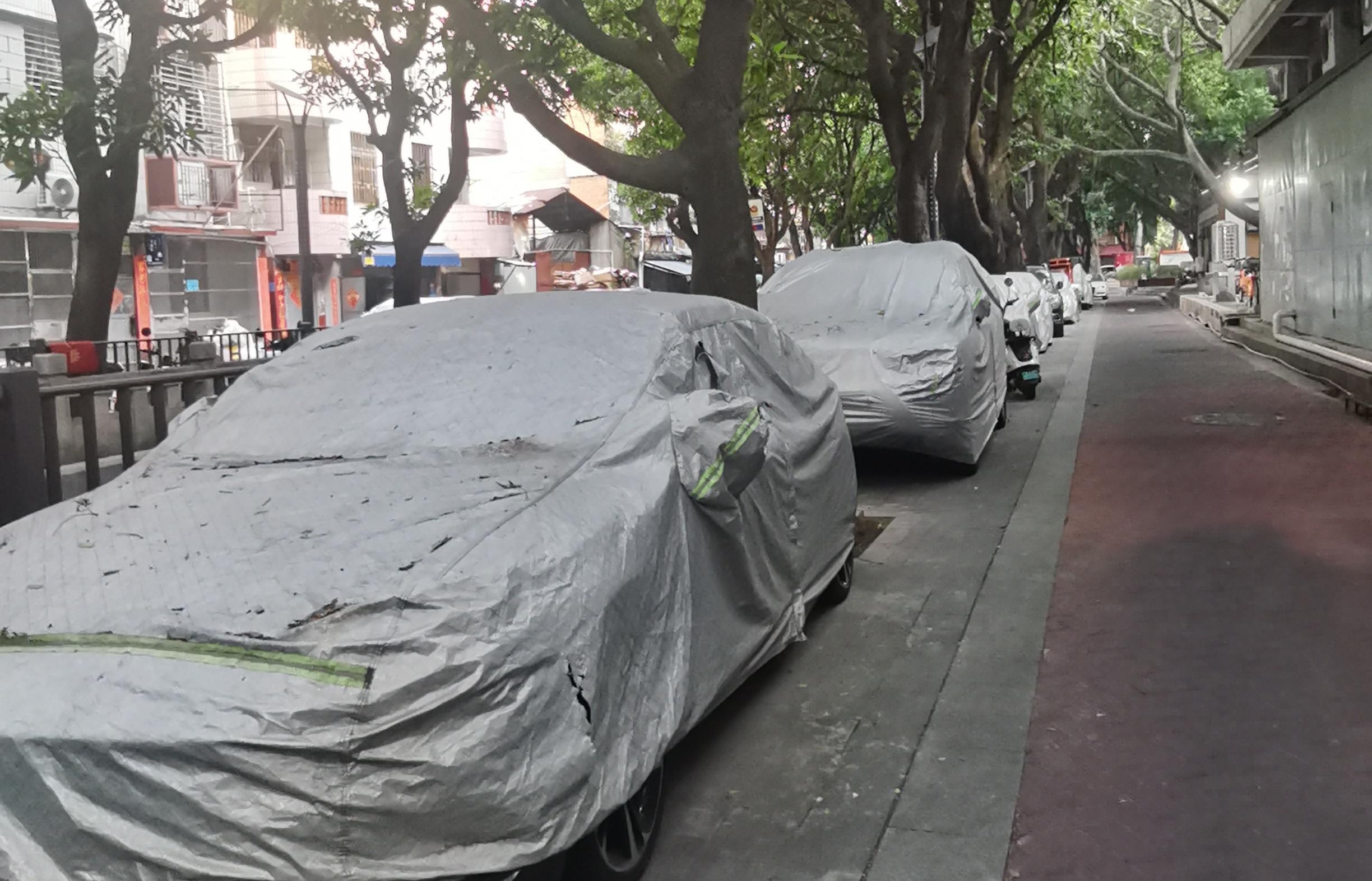 在这些违停车辆中,有二十余辆被银灰色车罩完全包裹,车罩表面积满厚厚的粉尘,落叶、杂物夹杂其间,部分车罩已撕裂破损,边角还粘连着泥土,显然已在此“安家”多日,长期未移动。