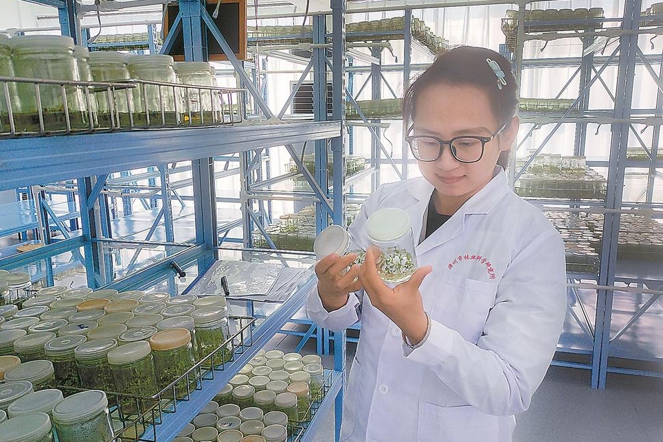 漳州市林业科学研究所工作人员察看托里桉组培苗生长情况。(资料图片)