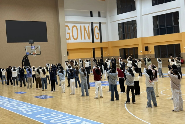 校运会开幕前两周,东区田径场便已响起整齐的口号声。彼时气温骤降至十度,凛冽的寒风裹挟着沙尘掠过赛场,却未吹散方阵、千人操与彩旗队队员们的排练热情。每天傍晚 6点天将暗时,五十余名方阵队员便身着单薄训练服集结,在文化部干部的指导下调整步伐——从摆手高度到踏步频率,从方阵间距到转向角度,每一个细节都要经过数十次磨合。“风刮在脸上像刀子割,手冻得握不紧拳头,但没人愿意请假。”方阵队员、人工智能学院2024级大数据张颖说,为了开幕时呈现出最整齐的队形,他们常常在寒风中一站就是两小时,休息时只能原地搓手跺脚取暖。