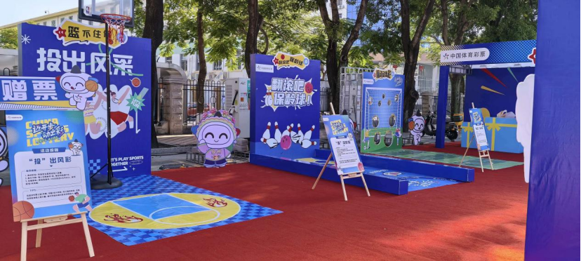 展区内氛围热烈而有序,3米高的体彩吉祥物“乐小星篮球伙伴”形象墙成为网红打卡焦点。