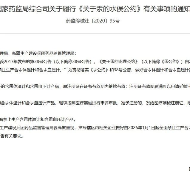根据国家药监局综合司关于履行《关于汞的水俣公约》有关事项的通知,自2026年1月1日起,禁止生产含汞体温计和含汞血压计。通知要求: