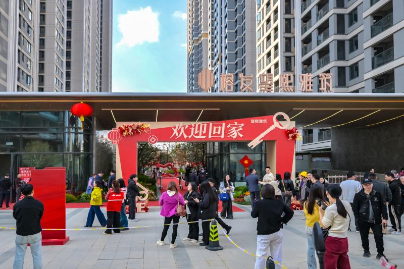 清晨的白马河,河水悠悠南流,倒映着一栋栋新楼的挺拔身姿。榕发·望熙雅筑小区内,高悬的大红灯笼与“欢迎回家”的暖金色大字相互映衬,让现场暖意融融。