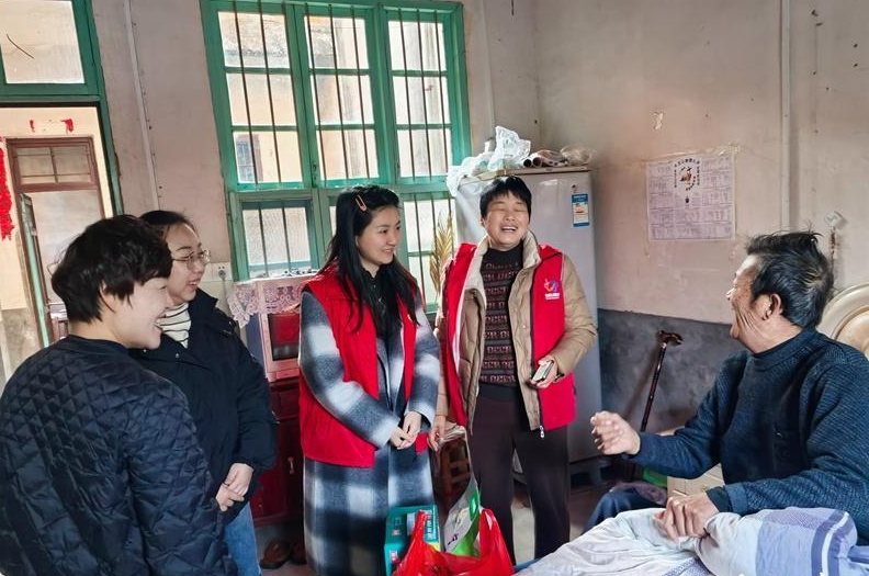 吴玥(中)深入困难村民家中慰问。(受访者供图)